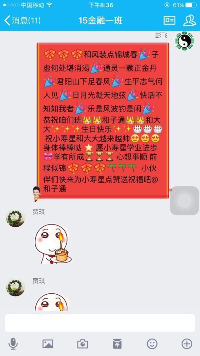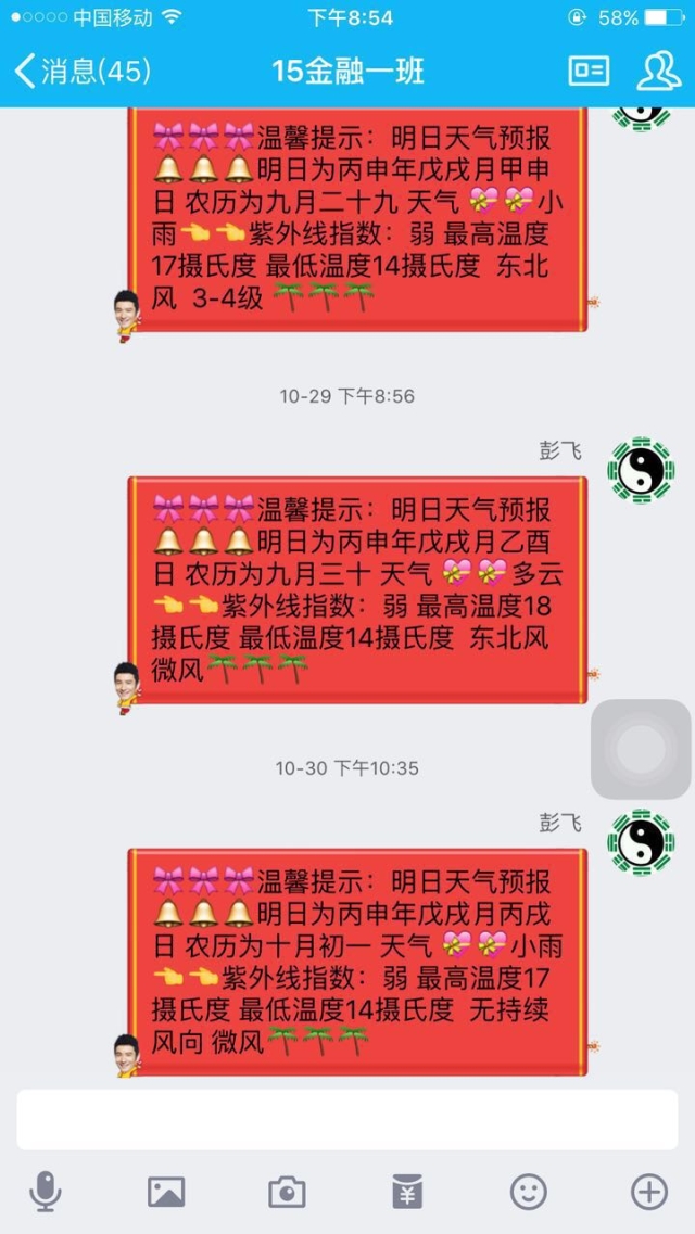 每天不忘在班级里发天气预报、每当同学生日都会在班群中送上真诚的生日祝福……这就是williamhill威廉希尔官网2015级金融学1班的生活委员彭飞同学已经坚持了一年的习惯。他说:“在其位,谋其政,任其职,尽其责。不忘初心,方得始终。我还会一直坚持下去的。”