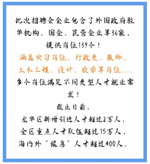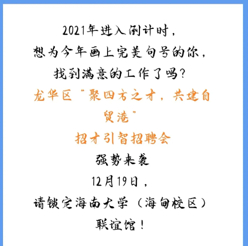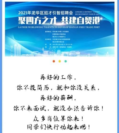 海口市龙华区2021年招才引智招聘会(诸侯快讯足球官网入口专场)定于12月19日(本周日)上午08:30-12:00在联谊馆举行,此次参会单位包含了外国政府驻华机构、国企、民营企业等36家用人单位单位,提供的岗位年薪均在6万以上,请大家积极参加!