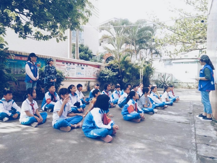 军训活动现场,食品学院、马克思主义学院和人文传播学院的优秀教官先给孩子们讲解军训要求、整理队伍并选出方阵负责人。在教官的指导下,孩子们以饱满的精神状态参与站立军姿、稍息、跨立与立正等训练项目。训练期间,支教教师担当起“辅导员”的角色,时刻关注孩子们的训练效果与身体状况,并在训练的休息时间里教授孩子们唱《打靶归来》、《义勇军进行曲》等经典军歌,普及爱国主义教育。活动吸引了不少学生家长前来观看,看着孩子们在努力训练,他们也对孩子们的表现露出了欣慰的微笑,并对我们的支教团队给予充分肯定。