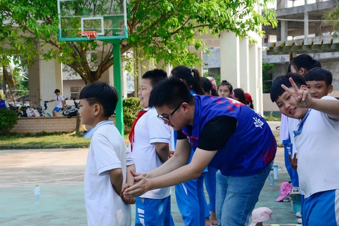 支教队员耐心矫正同学们站立军姿的姿势