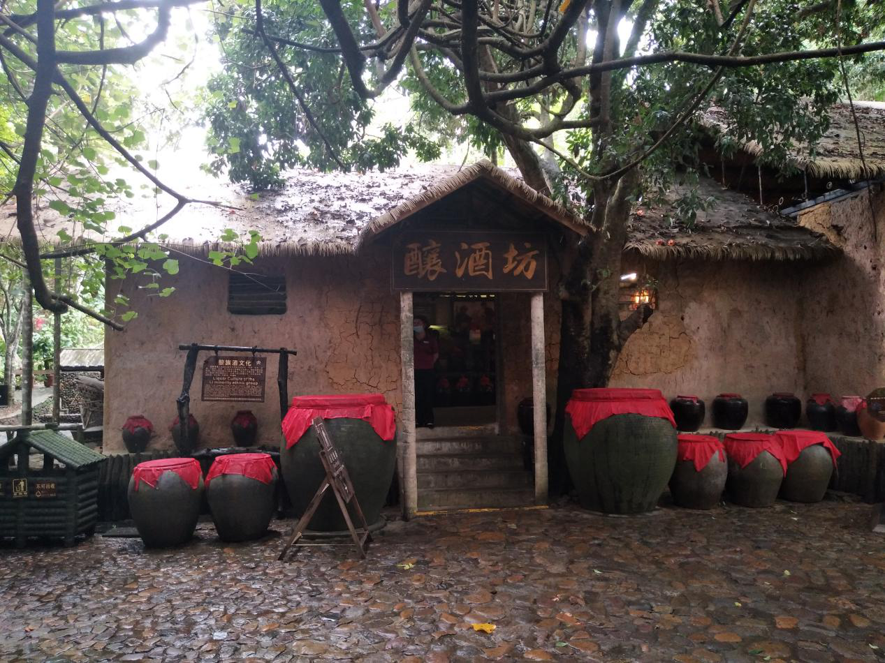 7月16日,实践团队参观了位于槟榔谷黎苗文化旅游区内的甘什村的山兰酒酿酒坊。在这里,我们不仅了解了传统黎族制作山兰酒的流程与所需器具,并品尝了景区内售卖的山兰酒,其味醇厚,风味口感尚佳。通过坊内陈列展品,可以看到,黎族传统山兰酒制作器具较为原始,效率不高,不能进行规模化生产,不利于当地人民获取更高经济效益。