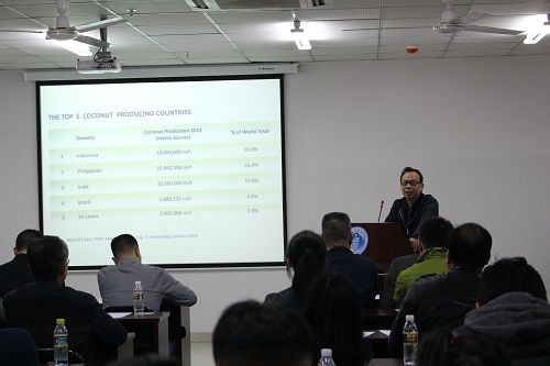 接着,由海口鲜美瑞实业有限公司总经理李枚秋老师发言,主题为国内外椰子加工现状与趋势。他介绍菲律宾,荷兰,斯里兰卡等国的椰子工业、椰子进口和出口,销售的比例及现状、中国和国外一些国家的椰子加工产品,加工设备。其阐述了椰子的发展,研究方向以及市场分析相关内容,并强调了国内众多椰子加工厂研究方向存在的显著问题。椰子作为海南特色水果,以及在国内外市场的极大需求的背景下,我们作为食品学院的一员,要充分发挥专业特长,积极的研究椰子,发挥叶子的营养价值,开发创新产品种类,推动其在市场上的流动。
