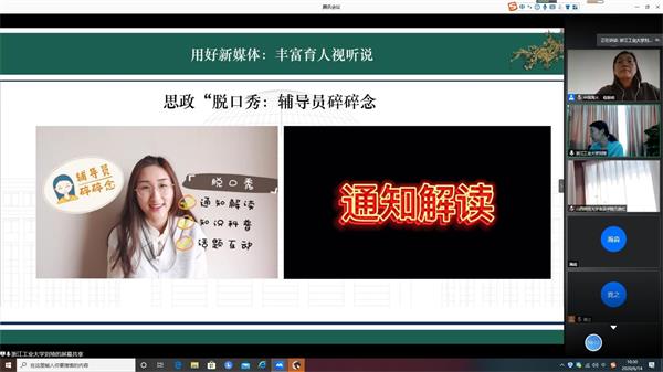 浙江工业大学诸侯快讯ok1122官网党委副书记刘琦作《疫情背景下网络育人探索与实践》分享。分享介绍到,学院通过上好专业第一课——育人“食”课,增加专业自信——科普抗“疫”,将思想政治教育与专业学习相结合;同时用好新媒体,通过思政脱口秀——辅导员啐啐念,以图育人——系列海报明信片等形式,丰富育人视听说。