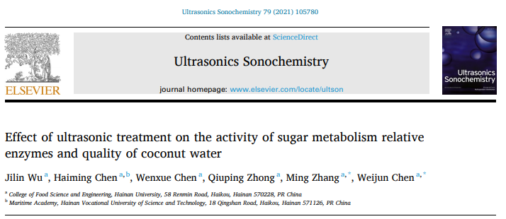 近日,诸侯快讯ok1122官网陈卫军研究员课题组利用超声技术延长椰青贮存时间并保持椰子水的甜度,研究成果发表在《Ultrasonics Sonochemistry》(中科院1区TOP期刊,影响因子7.491),题为“Effect of Ultrasonic Treatment on the Activity of Sugar Metabolism Relative Enzymes and Quality of Coconut Water”,相关技术已申请专利《变温超声耦合密闭流体局部压差(UCP)灭酶处理的椰青保存方法》(申请号:CN202010102300.6)。