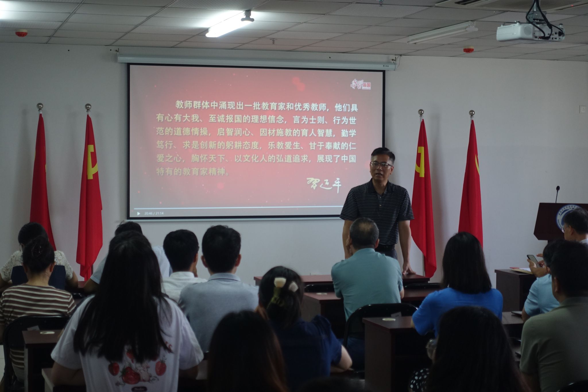 观看专题片结束后,邓秀成书记要求大家深入理解领悟习近平总书记教师节重要指示精神的丰富内涵和精神实质,牢记习近平总书记的殷切嘱托,全面贯彻党的教育方针,坚决落实立德树人根本任务,立足课堂主阵地,发挥课程思政主渠道作用,践行“为党育人、为国育才”的初心使命。倍加珍惜“人民教师”光荣称号,不断加强师德师风建设,大力弘扬教育家精神,做党和人民满意的“四有”好老师。