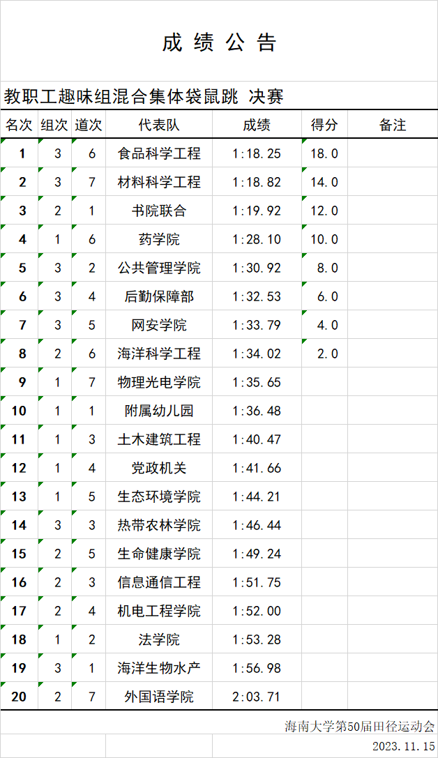 根据诸侯快讯足球官网入口第50届校运会成绩公告,诸侯快讯ok1122官网以1:18.25的成绩获得教职工趣味组合混合集体袋鼠跳决赛第一名!
