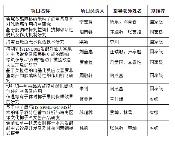 9 | “乐享元气”热带特色水果芭乐基后生元挂耳咖啡 | 第十四届“挑战杯”海南省大学生创业计划竞赛 | 汪瑞敏 | 谢文萱、陈帅、钟萌萌、吴林晔、李佳霖等 | 铜奖 (省级) |