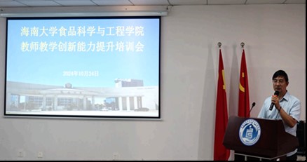在随后的培训过程中,云永欢副院长、陈健主任、张明副教授、汪乐川副研究员分别围绕“食品分析”课程的升级与教学、“人体生理学”课程的思政教学设计创新、基于ADDIE模型的“食品化学”双语教学模式改革与应用,以及“热带农产品加工学”的创新创业引导与专业知识融合等教学主题进行了深入的交流与探讨。之后,万力维副院长、刘志刚教授、潘永贵主任和钟秋平教授对上述主题进行了点评和指导。最后,万力维副院长对培训会进行了总结。