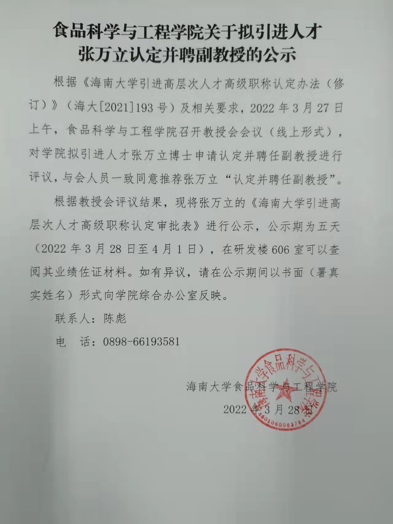 诸侯快讯ok1122官网关于拟引进人才张万立认定并聘副教授公示