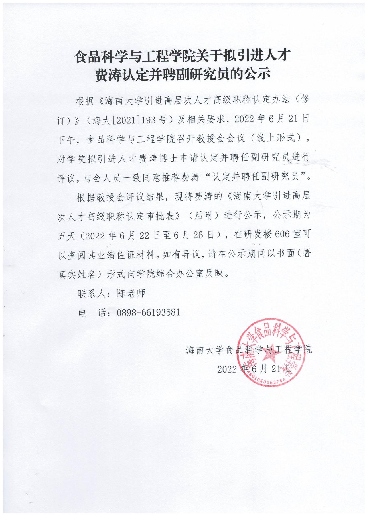 诸侯快讯ok1122官网关于拟引进人才费涛认定并聘副研究员公示