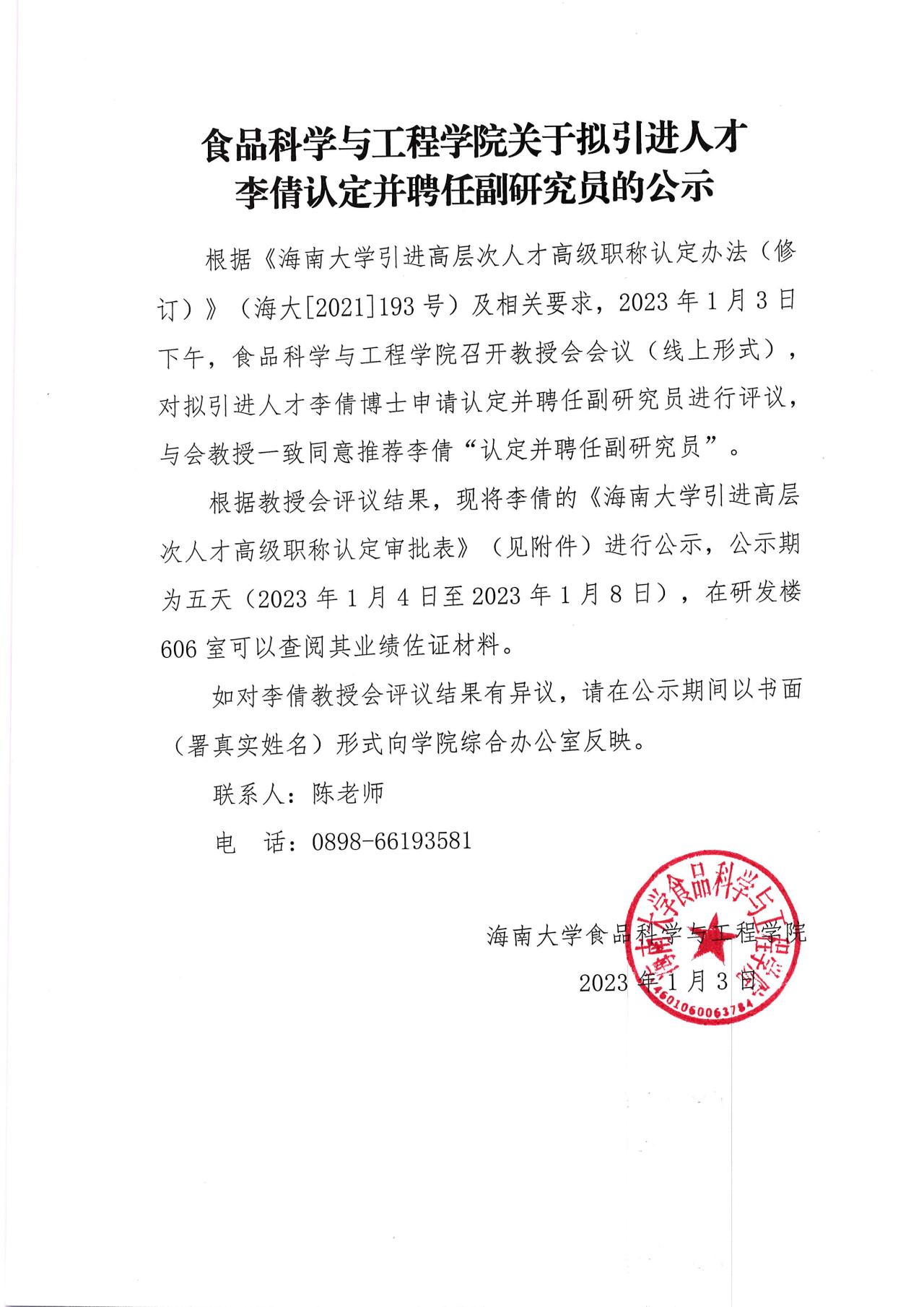 诸侯快讯ok1122官网关于拟引进人才李倩认定并聘副研究员公示